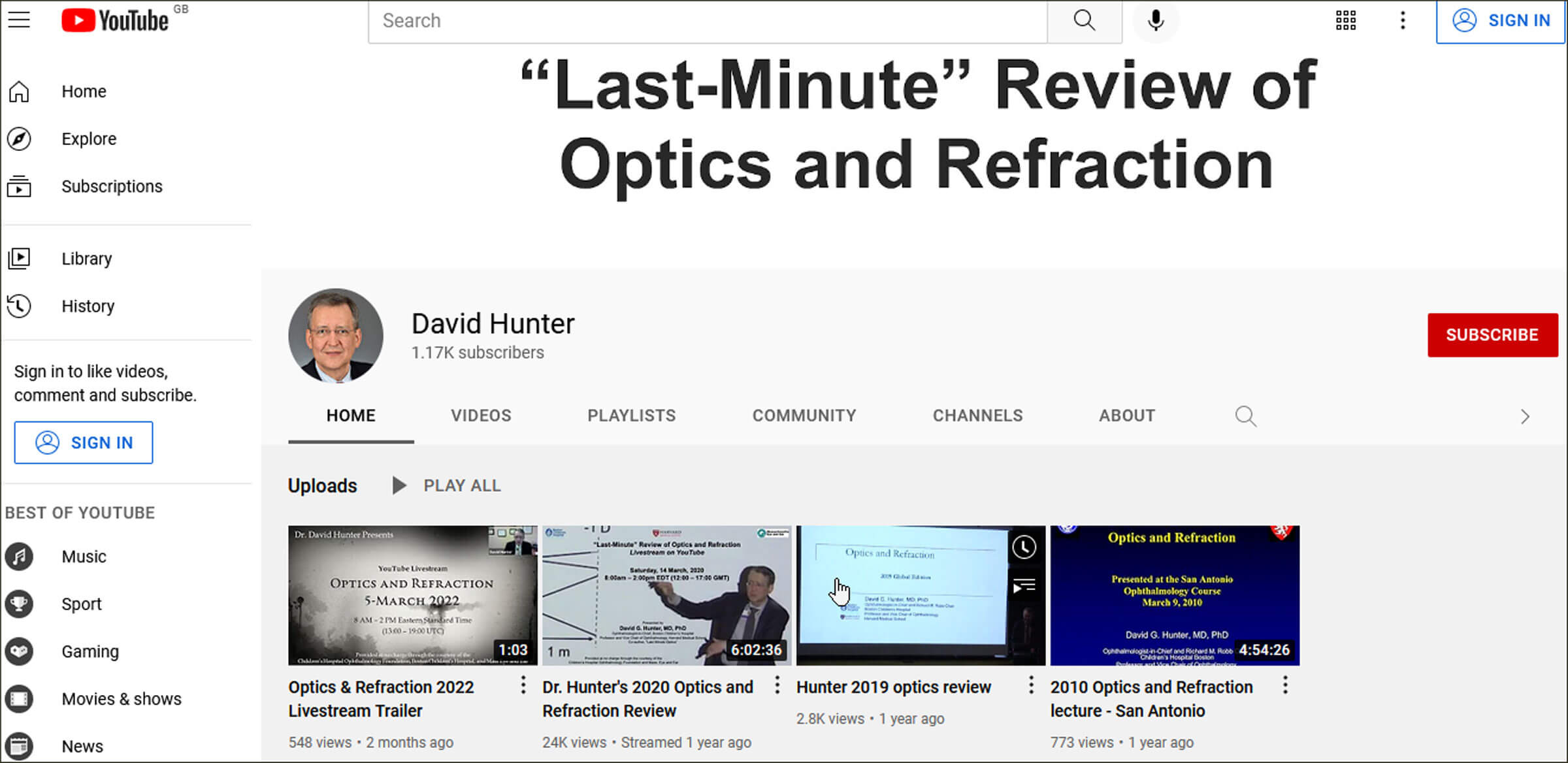 Dr David Hunter is the Ophthalmologist-in-Chief at Boston Children’s Hospital and Professor and Vice Chair of Ophthalmology at Harvard Medical School. His YouTube channel presents annual reviews of optics and refraction. His lectures on optics and refraction are one of the best that I have watched so far. Each annual review lecture is usually live-streamed in February or March and can be watched as a recording on his channel afterwards. Each lecture lasts about six hours. The lastest 2021 lecture covered the top 10 optics topics, including Prentice’s rule, Vertex distance, magnification of a telescope, Jackson cross cylinder, size of a scotoma on tangent screen, accommodation, cause of acquired refractive errors, object / image placement, contact lens fitting and surgically induced refractive errors. This lecture was divided into four parts: basics in optics, refraction, other optics of note, and practical optics. This channel is perfect for those starting to learn optics, as the content is interesting and very well explained. It is also good for those who would like an update of their optics and refraction knowledge.