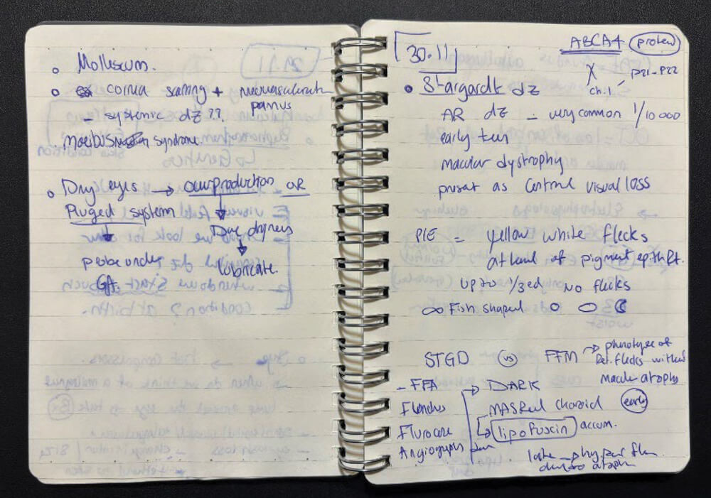 During my elective, I carried a small notebook to jot down observations, key takeaways from cases, surgical techniques, and conditions requiring further research. I encountered several conditions I had never seen during my medical school ophthalmology placement, including persistent pupillary membrane, pseudoexfoliation syndrome, asteroid hyalosis, blepharophimosis, Stargardt’s disease, and harlequin-type ichthyosis - many of which I might have forgotten had I not documented them.