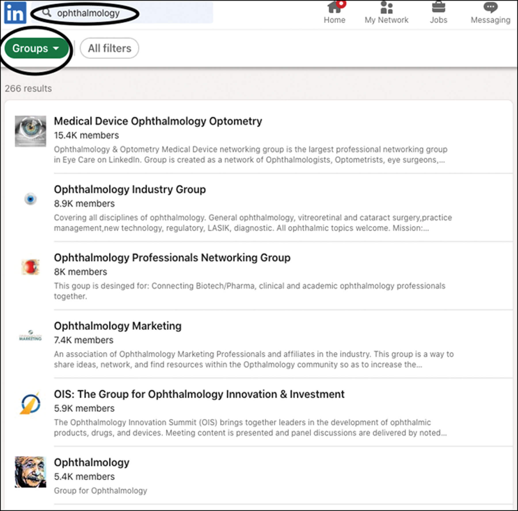 By searching ophthalmology related groups, you can use the search bar