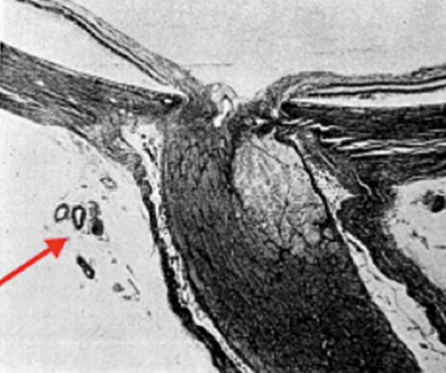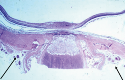 Figure 5: Top: (a) Retrolaminar infarct in the optic nerve with patent posterior arteries (arrowed) in NA-AION after Cogan. Bottom (b) Infarcted optic nerve head and retrolaminar infarction in AAION with occluded arteries from GCA (arrowed).