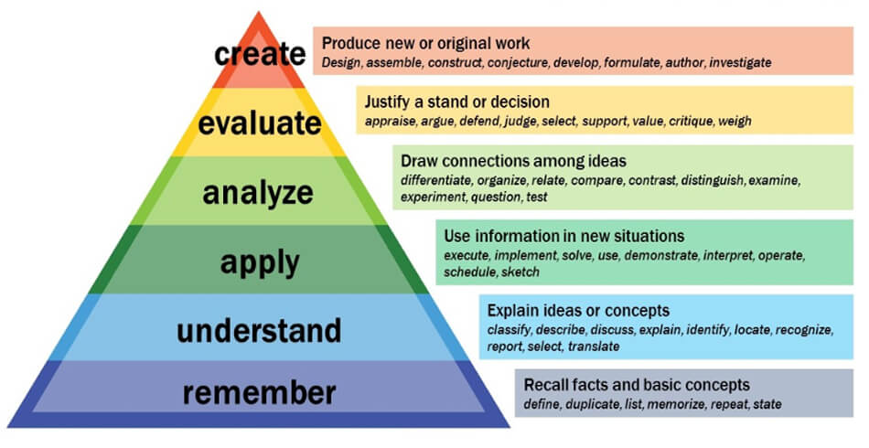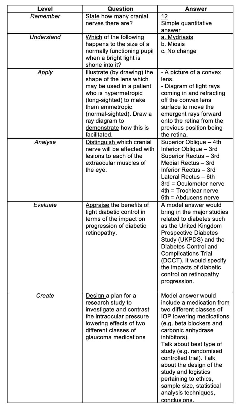 Several decades later in 2001, the taxonomy was revised by a diverse group of educationalists into six distinct domains, each level requiring pre-requisite understanding of the level below [2]. In this article, the author discusses how the revised taxonomy may be used to develop assessment questions in ophthalmology; bringing in an example from each stage of the taxonomy.