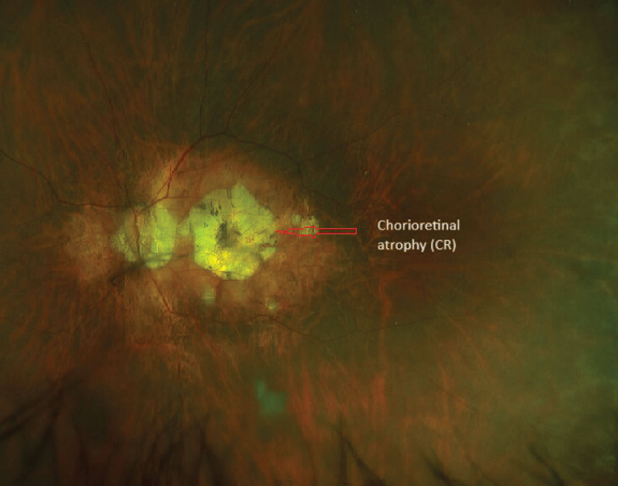 The increase in the axial length in high myopia can lead to progressive thinning of the choroid and its vasculature. The photoreceptors receive their nutrition from the choroid. The thinning of choroid and its vasculature leads to loss of photoreceptors and RPE loss. Chorio-retinal atrophy can occur in the peripheral retina or involve the macular region. Chorio-retinal atrophy involving the macular region can be patchy or diffuse with both types being a predisposing factor for formation of choroidal neovascular membrane (CNV) [12].