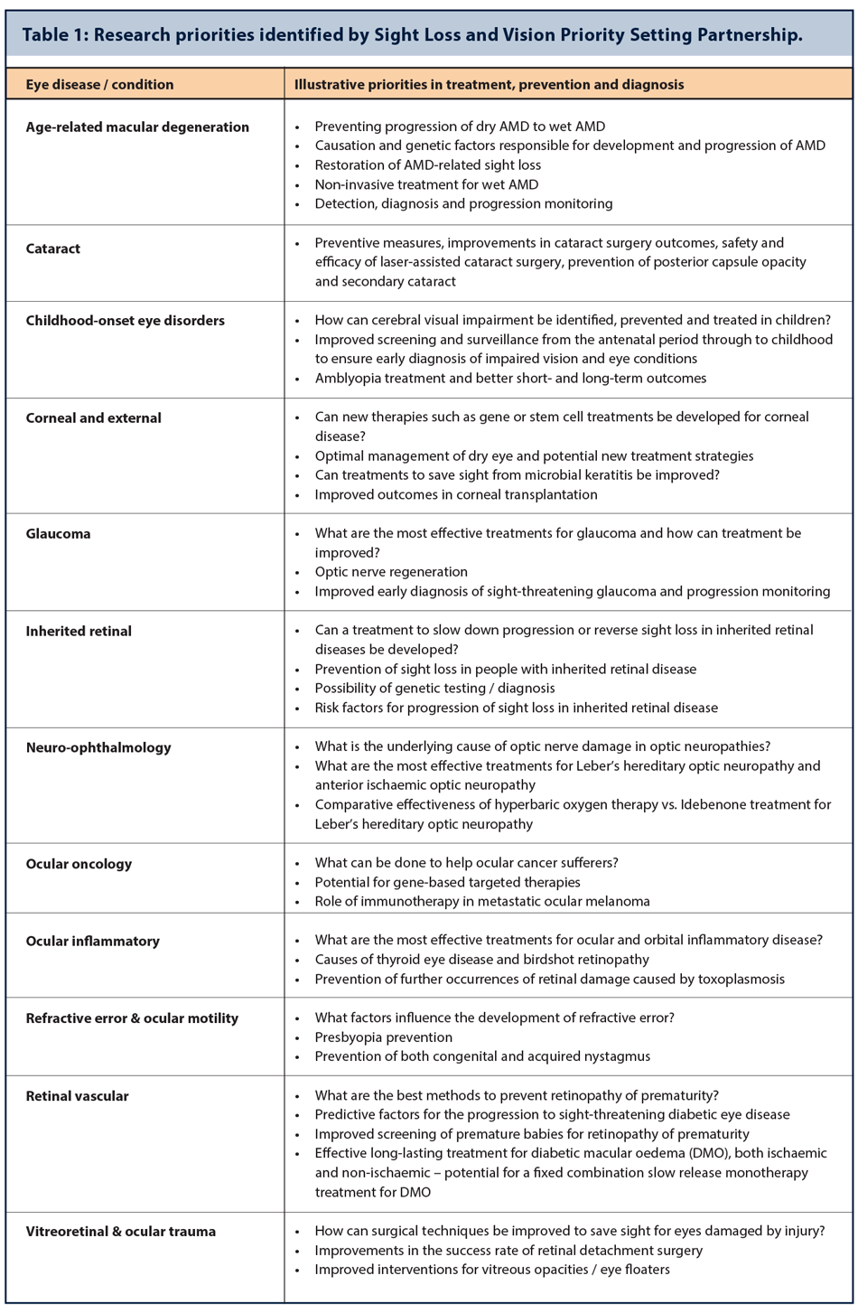 Patients, clinicians and clinician-scientists play a valuable role in shaping the future of vision research. Limited funding demands targeted research initiatives that ultimately will shape health policy and practice to secure progress in improving patient outcomes in eye health. This review outlines several initiatives designed to better identify and prioritise unanswered questions about the prevention, diagnosis and treatment of sight loss and eye conditions.