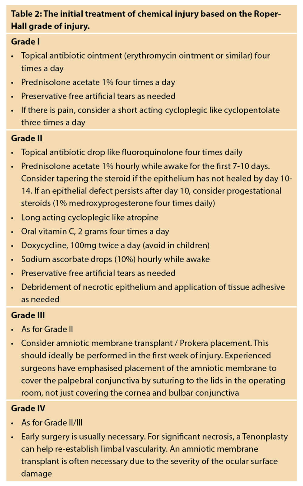 While there is variability in treatment strategies of chemical burns, most authors recommended a graded approach depending on the severity of injury. Mild burns (Roper-Hall grade I) respond well to medical treatments and lubrication, while more severe burns necessitate more intensive medical therapies and surgery. Table 2 shows a paradigm for the initial treatment of chemical injury based on the Roper-Hall grade of injury.