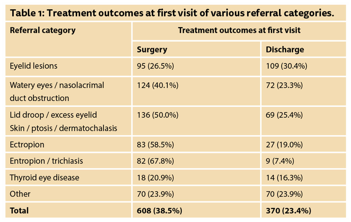 A total of 1581 new patients were seen in our oculoplastics service over the year. The descriptions used in the referrals were used to determine the referral categories of oculoplastic conditions and these are presented in Figure 1. The most common referral category was eyelid lesions (22.6%), followed by watery eyes / nasolacrimal duct obstruction (19.5%), lid droop / excess eyelid skin / ptosis / dermatochalasis (17.2%), ectropion (9.0%), entropion / trichiasis (7.7%) and thyroid eye disease (5.4%); 38.5% of all patients were listed for surgery at the first visit and 23.4% were discharged at this visit. A breakdown of these treatment outcomes is given in Table 1.
