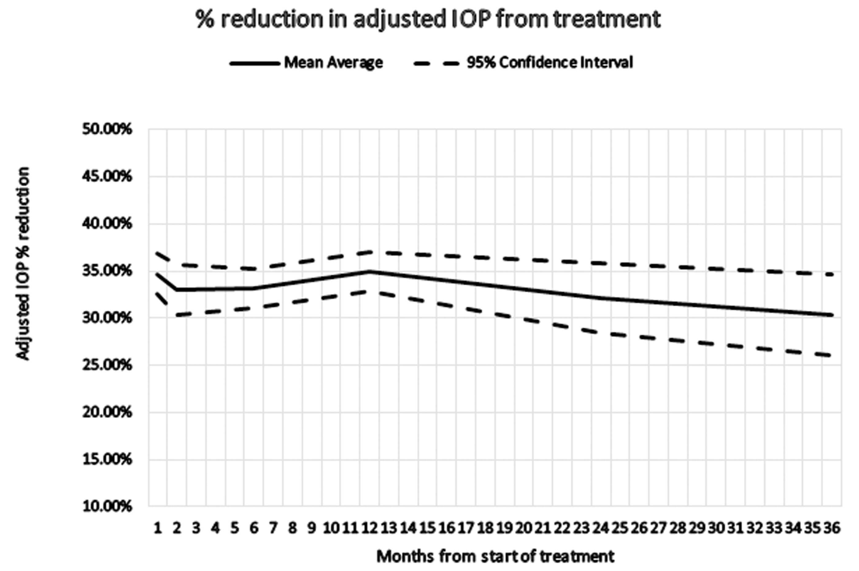 Figure 1: % reduction in adjusted IOP after treatment over time.