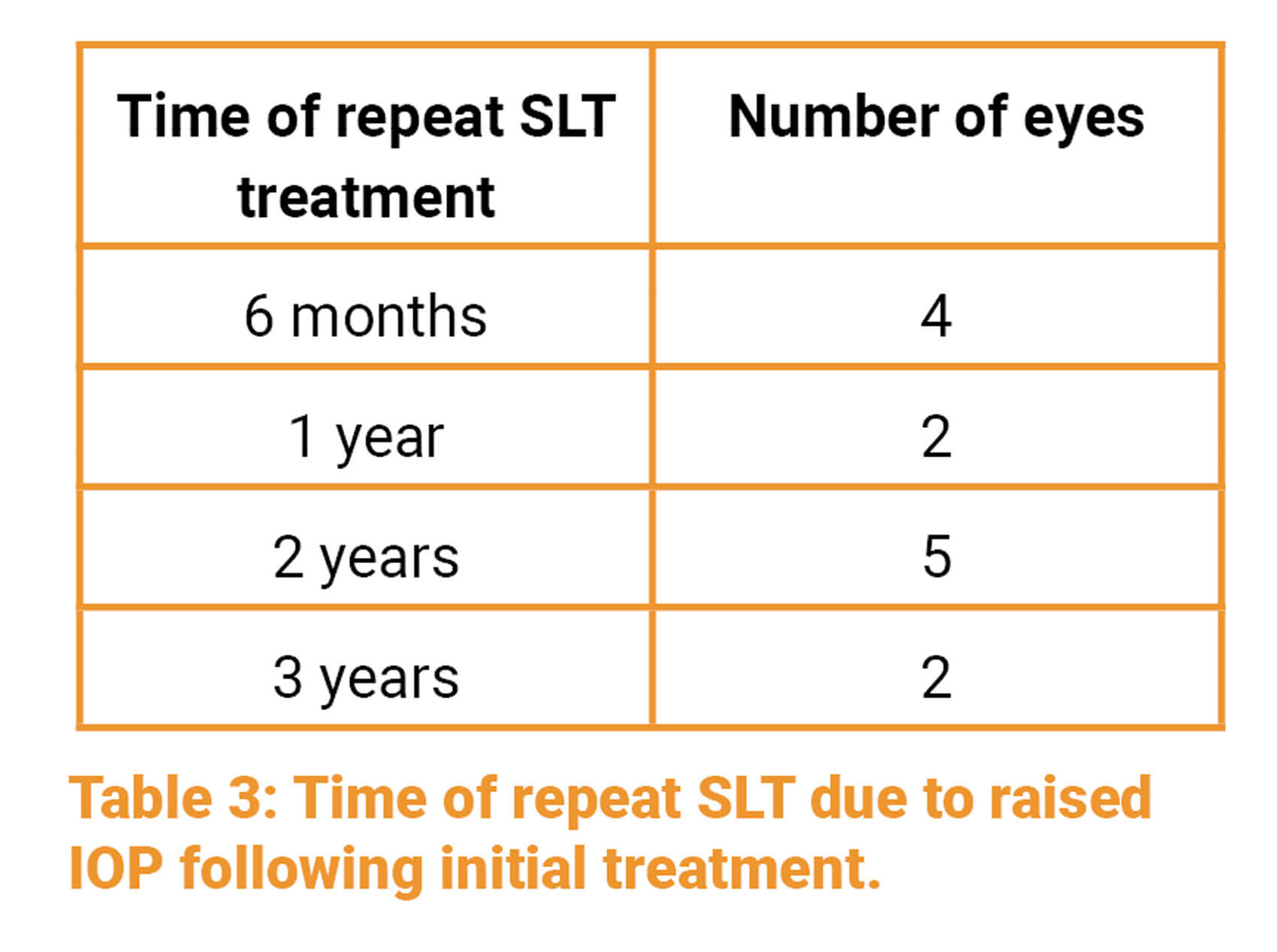 Some eyes were retreated with SLT at later time points. Thirteen (5.9%) eyes had one repeat treatment of SLT between six months to three years.