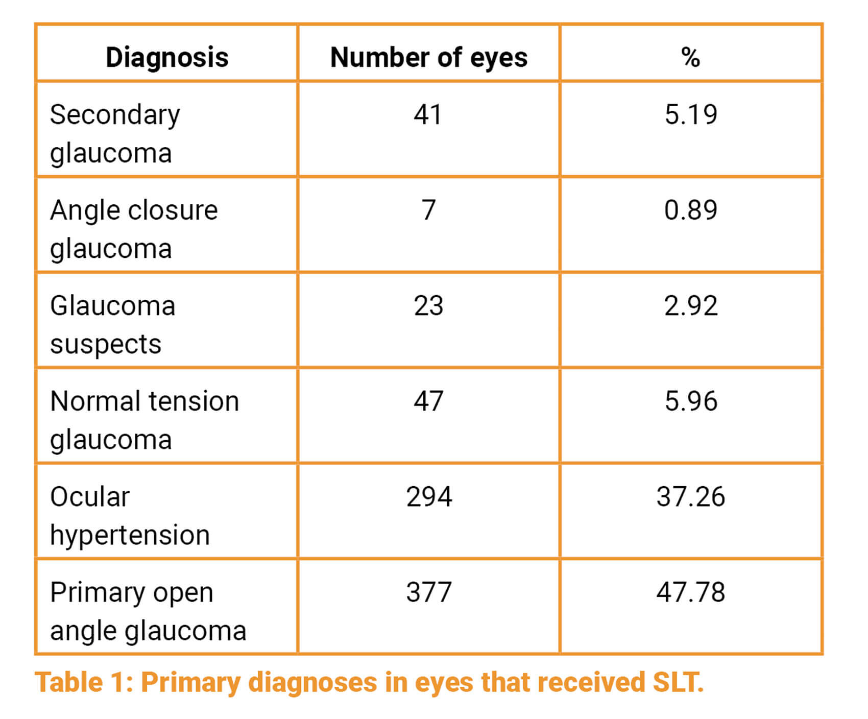Seven hundred and eighty-nine eyes received SLT between September 2013 and September 2018. The primary diagnoses were as follows: