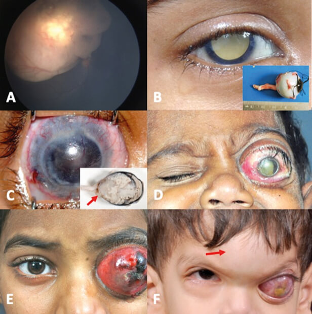 Figure 1: Stages of retinoblastoma disease. (A) Stage 0; (B) Stage I with no microscopic tumour residue; (C) Stage II with microscopic tumour residue due to extraocular tumour noted after enucleation (red arrow); (D) Stage III with optic nerve tumour extension; (E) Stage III with extraocular tumour extension; (F) Stage IV disease with bony metastasis (red arrow). S Kaliki with permission