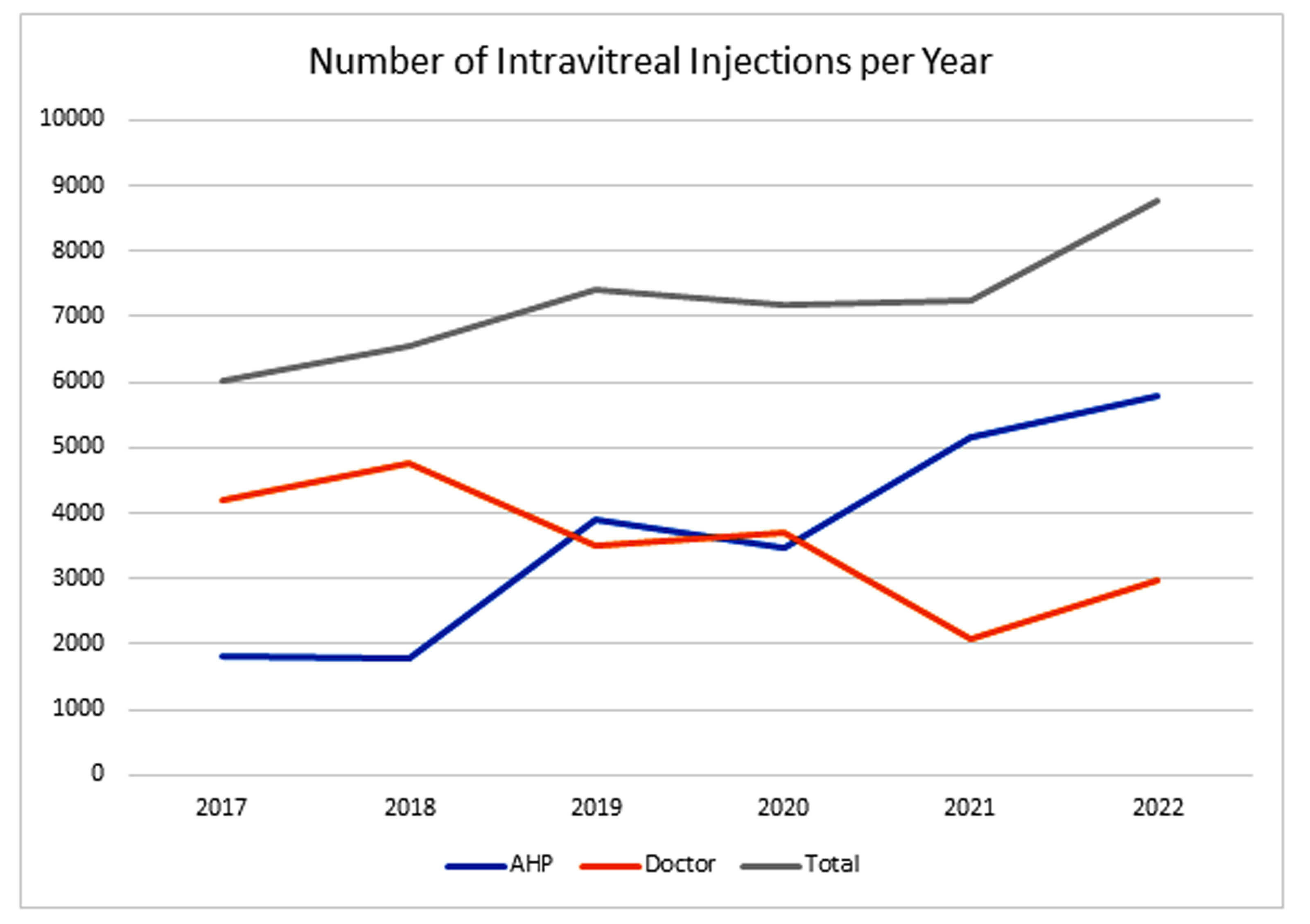 The vast majority of ophthalmology units utilise allied healthcare professionals (AHPs) to deliver intravitreal injections (IVIs). The Royal College of Ophthalmologists issued a statement 10 years ago advocating the use of non-medical practitioners performing IVIs [1].