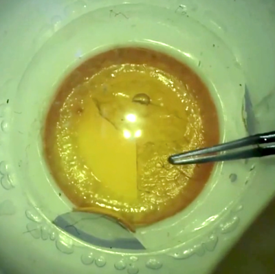 The advanced phaco eyes are spherical and have an anterior and a posterior chamber. The lens is encased within a capsule and the lens comes in a number of different densities, to simulate different types of cataract. The posterior chamber can be filled with egg white as a vitreous substitute. These eyes can be used to simulate either routine or complicated surgery such as posterior capsule (PC) rupture with vitreous loss (Figure 7) a dropped nucleus, dialysis +/- vitreous loss (insertion of capsular tension ring) and even an expulsive haemorrhage.