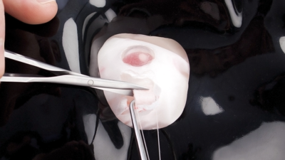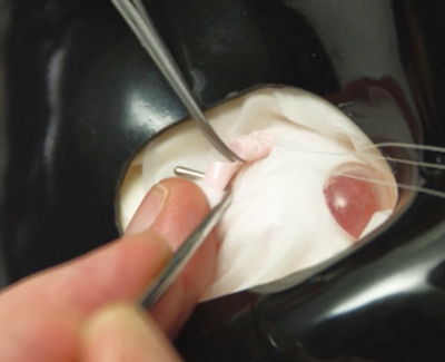 Both SOS model eyes and cadaver material can be used to simulate inferior oblique recessions (Figure 10) or myectomies and a range of superior oblique surgery including tucks, Harada-Ito procedures and posterior tenotomies. The same principle of becoming competent with each stage of the procedure before proceeding to live surgery also applies to these techniques.