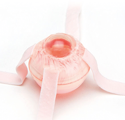 b) The advanced eyes (Figure 2) have the same scleral shell and rectus muscles, but they also have a layer of conjunctiva, with similar elastic properties of human conjunctiva, a layer of Tenon’s capsule and a superior or an inferior oblique muscle. The superior oblique tendon is made from a thin stretchy material that has a wide insertion under the superior rectus as in life. The inferior oblique tendon is more cord-like as it is in life (Figure 3). Both eyes sit in a mounting cup, which is placed in a model head.