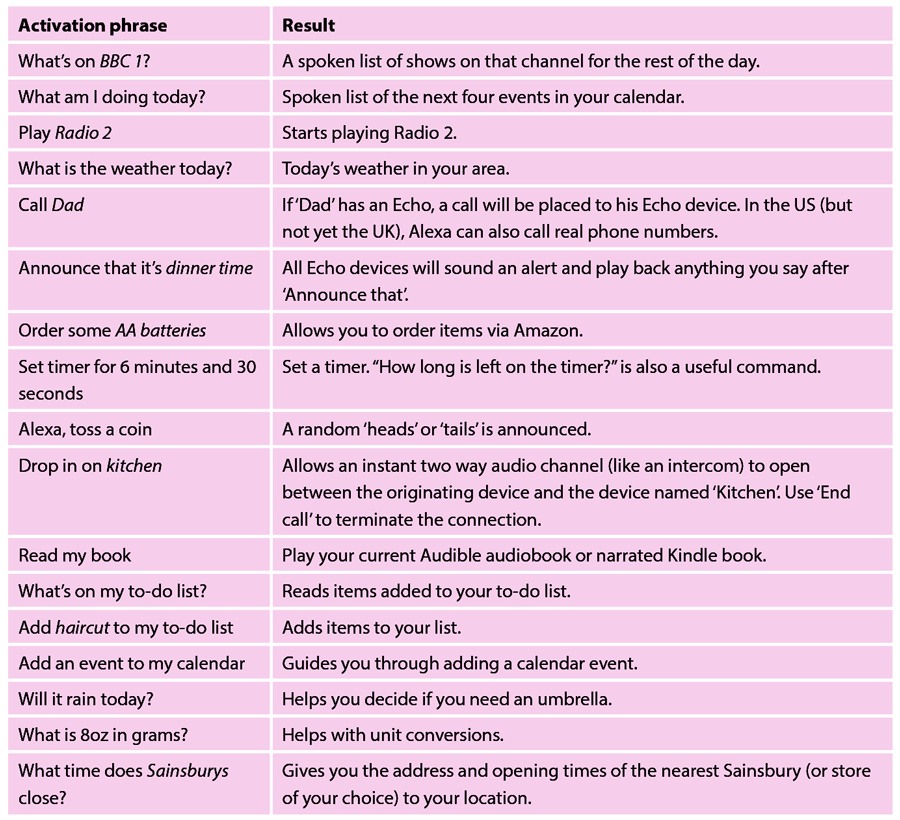 The list below gives some examples of popular commands. They are built-in features and require little, or no, configuration to enable. All requests need to be prefixed with the ‘wake’ word. By default this is ‘Alexa’ but can be changed to a few others. Many of these commands make the lives of sight impaired individuals much easier. For instance, having a spoken TV guide can be very helpful if acuity is too poor to read.