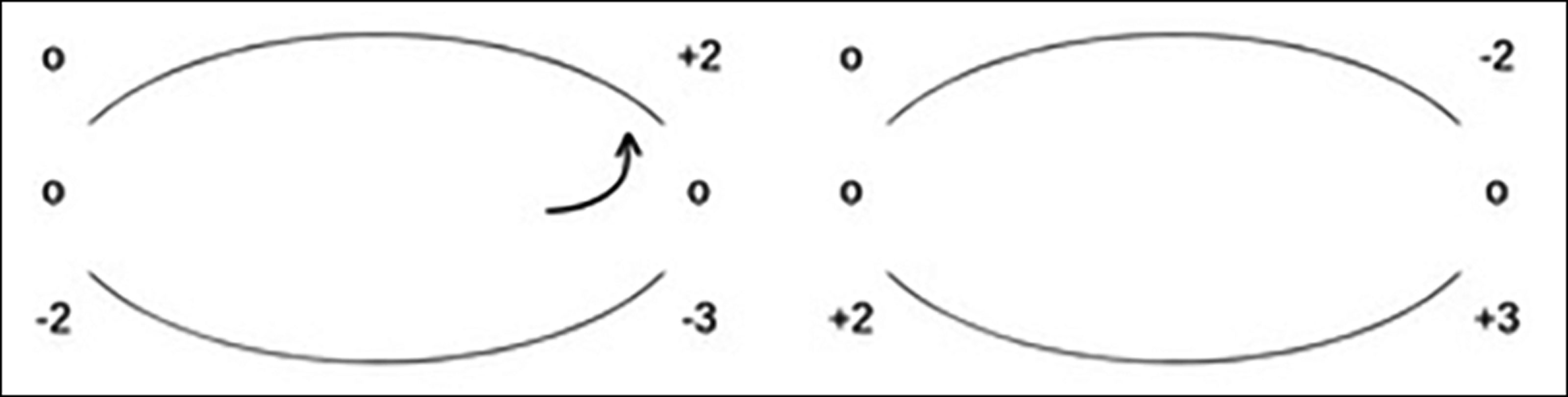 Hering’s law is crucial in understanding muscle under- and overactions. It states that a contracting muscle and its synergistic muscle in the contralateral eye receive equal and simultaneous innervation [3]. It means that when a muscle underacts due to weakness or restriction, the contralateral synergist overacts. On the OM diagram, underactions are represented from -1 to -4, and overactions from +1 to +4. Although the effect also occurs in horizontal muscles, it is only recorded for vertical muscle actions. Arrows denote upshoots or downshoots of an eye on horizontal gaze, due to significant underaction of a vertical muscle.