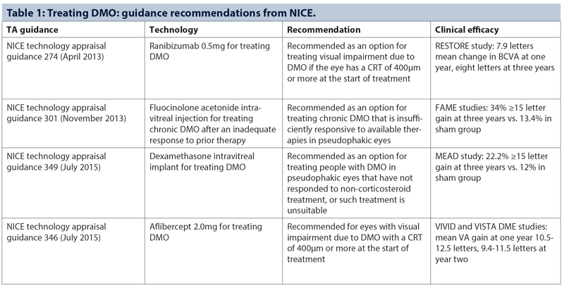 Guidance recommendations on the use of ranibizumab, fluocinolone acetonide intravitreal implant (Iluvien, Alimera Sciences), dexamethasone intravitreal implant (Ozurdex, Allergan) and aflibercept as possible treatment options for DMO have been issued by the National Institute for Health and Care Excellence (NICE) (Table 1).