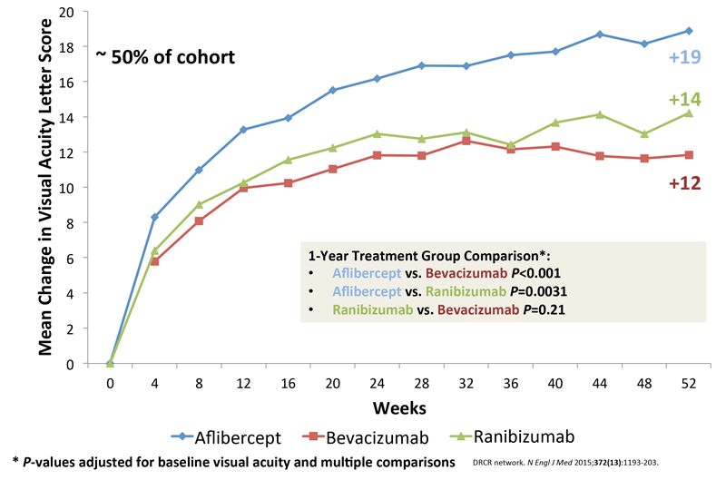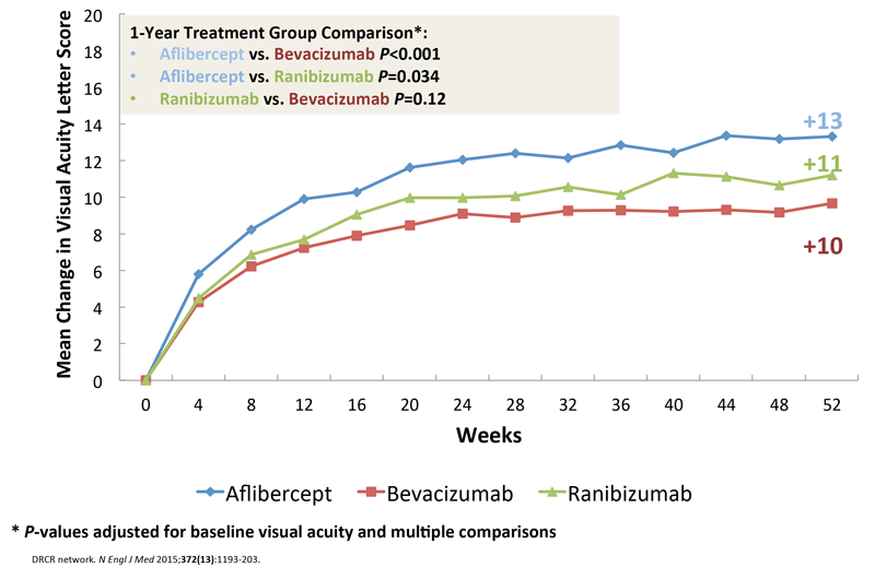 Overall, Protocol T showed that ranibizumab and aflibercept are superior to bevacizumab, while greater visual acuity improvement on average was seen with aflibercept than with the other agents. At poorer starting levels of vision, aflibercept had a clinically meaningful advantage: a gain in the VA letter score of at least 15 was observed in 63% more aflibercept-treated eyes than bevacizumab-treated eyes (67% vs. 41%), and in 34% more aflibercept-treated eyes than ranibizumab-treated eyes. Bevacizumab had a lesser effect on reducing macular oedema than the other agents, regardless of starting vision. Serious adverse event, death and hospitalisation rates appeared similar among treatment groups. No differences were noted in intraocular inflammation, and endophthalmitis was rare (0.02% of injections).