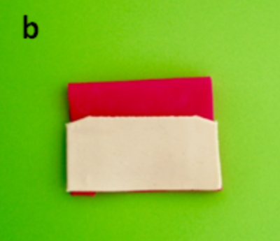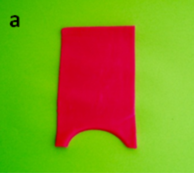 Roll out the PlayDoh® into a flat sheet and cut it into a tall rectangular shape, approximately 6 x 12cm, to represent the conjunctiva (red). Using the rim of an empty PlayDoh® tub, cut a semicircle from the inferior edge to represent the border of the conjunctiva at the superior limbus. Fold the top half of the conjunctiva over the bottom half to create the bulbar and tarsal conjunctiva joined at the superior fornix.