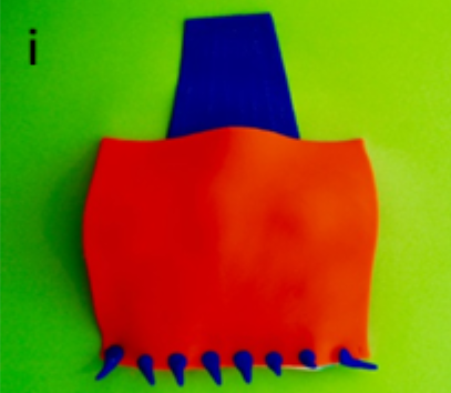 Roll a fifth colour of PlayDoh® into a flat sheet and cut this into a narrower levator muscle body fanning out into a wider levator aponeurosis (blue), the width of the tarsal plate. This inserts onto the anterior surface of the tarsal plate, one third of the way down.