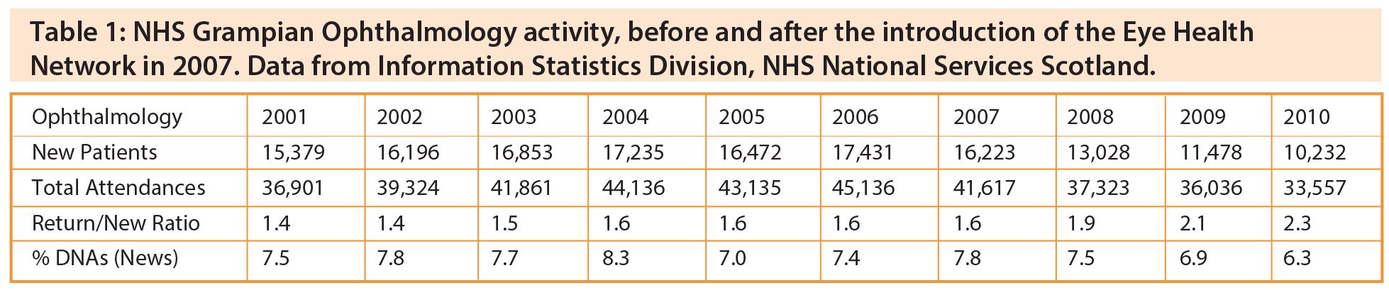 Prior to 2004 ophthalmology attendances in NHS Grampian were rising year on year (Table 1). Drivers included the introduction of retinal screening in 2002, photodynamic therapy for age-related macular degeneration in 2003 and the ageing demographic. The introduction of a community optometry glaucoma refinement scheme in 2004 seemed to staunch the rise, at least initially. The tide only really turned with the introduction of the new GOS contract in 2006, enabling postoperative cataract care and patients with ocular hypertension to be discharged to the community, and the introduction of the Eye Health Network in 2007. The introduction of an optical coherence tomography virtual clinic for diabetic macular oedema in 2008 had an additional modest benefit.