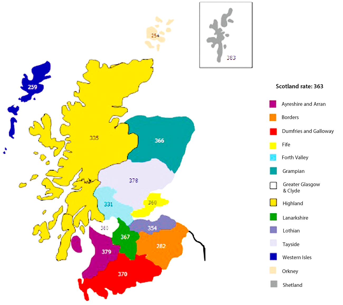 year ending March 2013. Data from Information Statistics Division, NHS National Services Scotland.