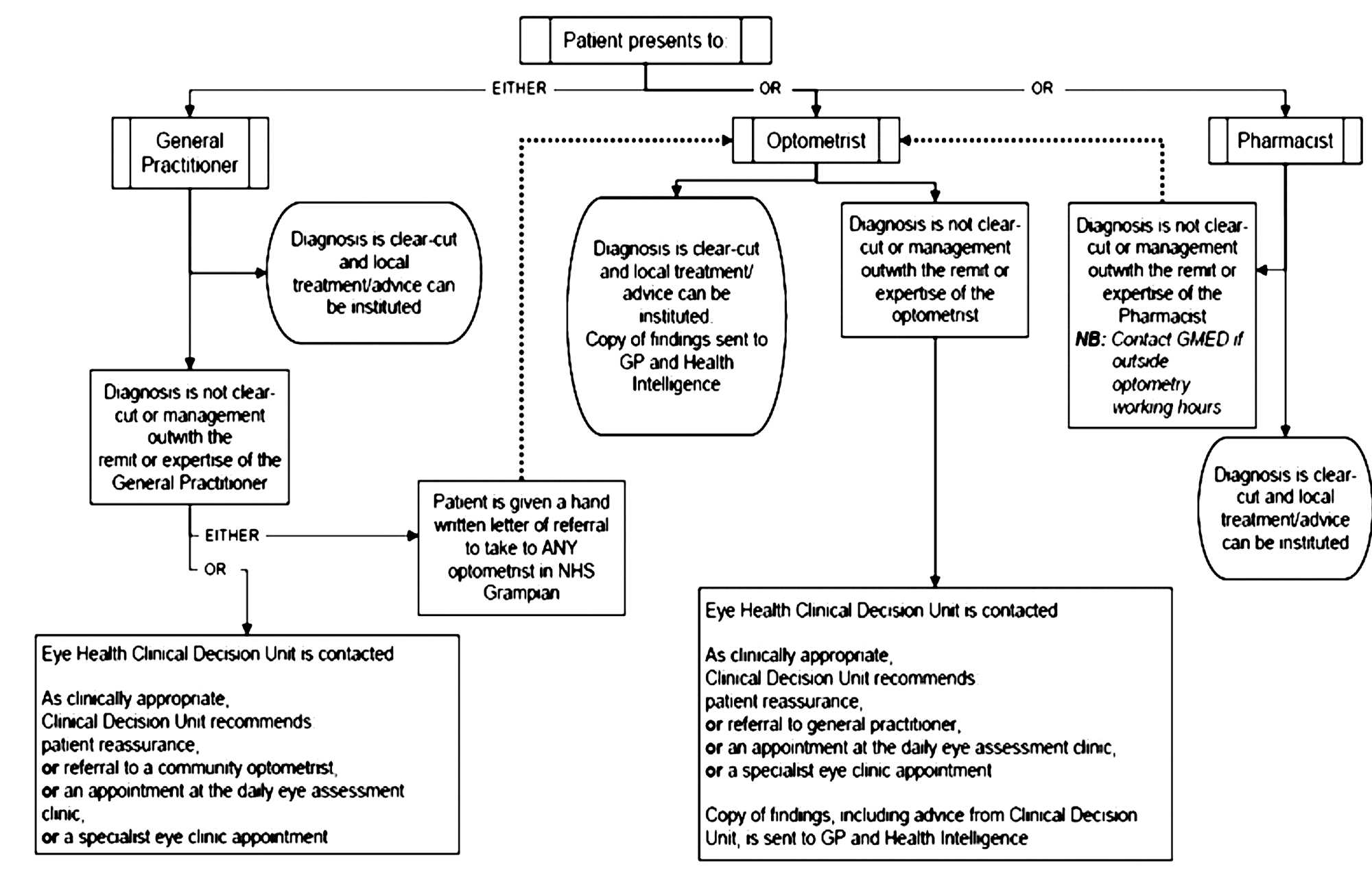 At that time, local access to eye care was haphazard, with patients randomly presenting to emergency medicine, general practice, pharmacy and optometry, or simply walking in to the eye clinic at Aberdeen Royal Infirmary.