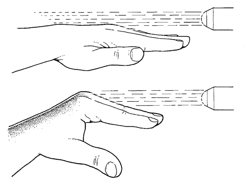 Figure 11: Not everyone has access to a tonometer. The hands lean on the forehead, while the index or middle fingers are held firmly together pulp to nail and firmly on the eye above the lateral end of the tarsal plate. A slight movement of one finger sets up a shimmer of fluctuation that is sensed by the other finger. This technique may record ‘hard’ by mistake but never ‘soft’ by mistake.
