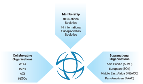 As an organisation, the ICO acts as a coordinating body and central point for global ophthalmology by collaborating with three groups of organisations (see Figure 1). It has 143 national, regional and subspecialty member societies from around the world. These are all members of the ICO and include the Royal College of Ophthalmologists. In addition, other collaborating organisations including the World Health Organisation (WHO) and the International Agency for the Prevention of Blindness (IAPB), as well as the supranational ophthalmic organisations, are all linked with the ICO.
