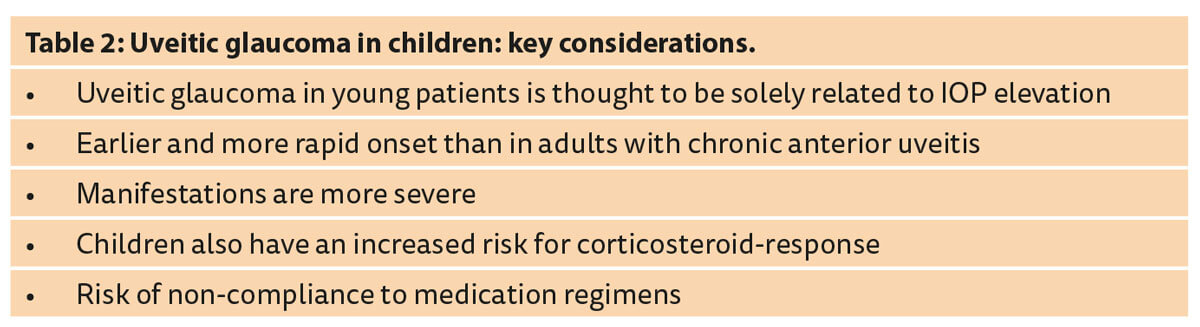 Professor Gary Holland, David Geffen School of Medicine at UCLA, USA, presented a uveitis specialist’s perspective on evaluation and treatment of uveitic glaucoma. Glaucoma / elevated IOP is a common complication of chronic anterior uveitis. The goal should be prevention of uveitic glaucoma by aggressive suppression of anterior segment inflammation. Corticosteroid treatment can contribute to control of elevated IOP in selected cases. The choice of medical or surgical treatments for elevated IOP in patients with uveitis may be different than in patients with age-related chronic open angle glaucoma. Close monitoring and follow-up is necessary, regardless of the treatment chosen, due to an increased risk of treatment failure. Table 2 summarises key considerations for managing uveitic glaucoma in children.