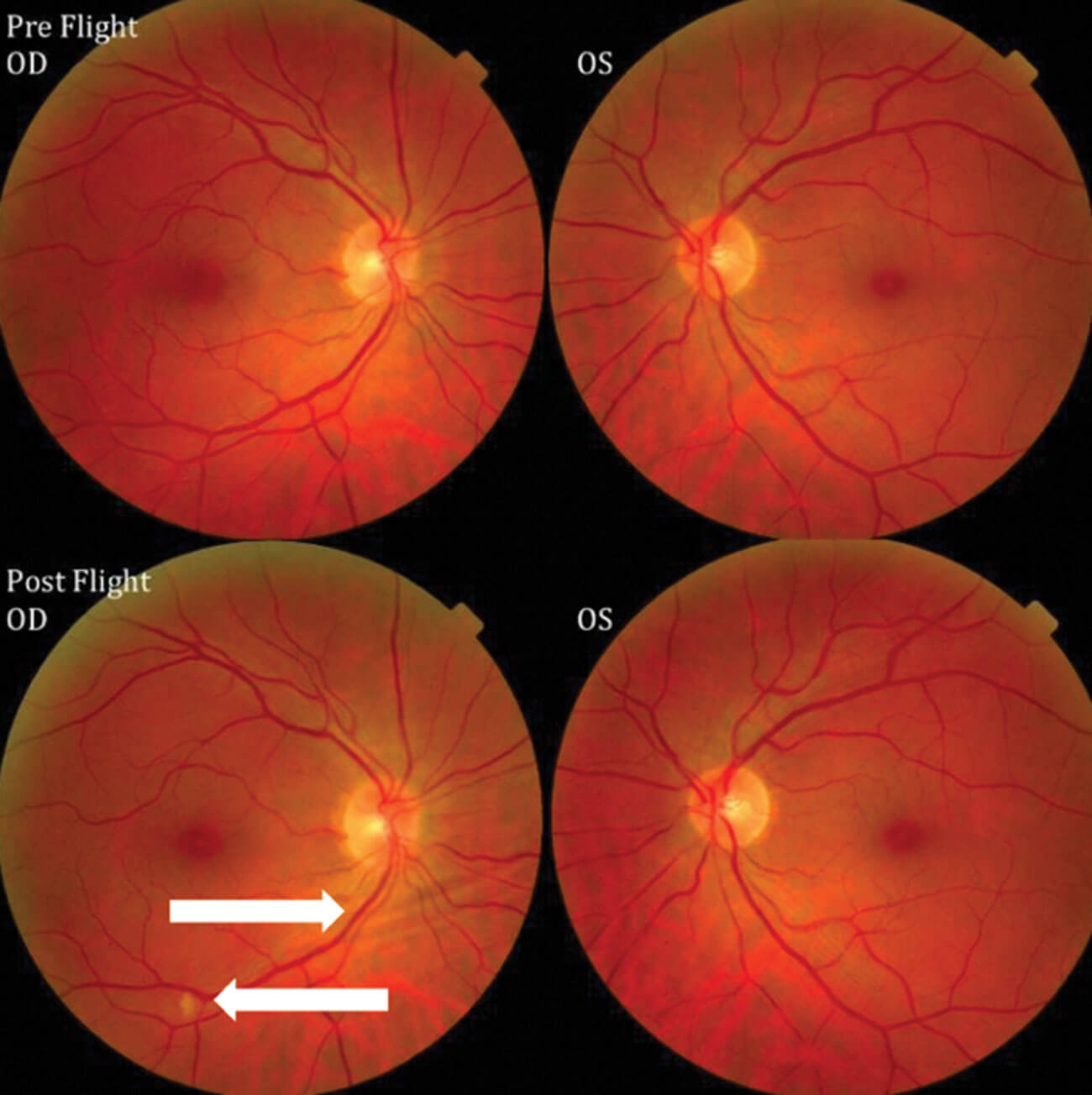 In the astronauts exposed to microgravity environments, posterior globe flattening, and pituitary dome concavity was also noted [5]. Fluid shifts within the brain have been shown on post-flight MRI. Limitations to inflight diagnostic procedures are caused by equipment portability and technical factors. Orbital ultrasound, fundoscopic examinations and OCT scans are used onboard the ISS, all of which have a role in detecting globe flattening, optic disc oedema, chorioretinal folds and cotton wool spots. More recently, with the introduction of the OCT angiography (OCTA) on the ISS, changes in choroidal blood flow may better our understanding of the cephalad fluid shift theory and SANS [6].