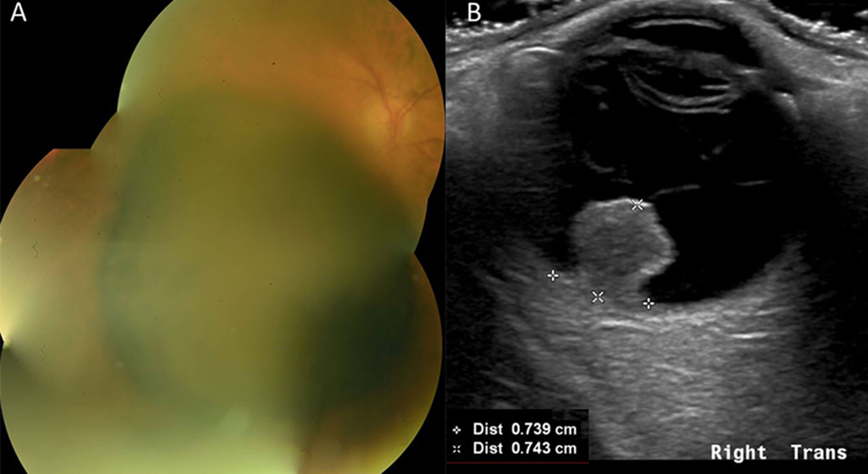 Figure 3: Right choroidal melanoma (AJCC Stage 2A); A: Large pigmented choroidal mass; B: Eye Ultrasound Scan highlights collarstud morphology,with Proton Beam Therapy (PBT) Measurements. [Basal dimensions 8.0 x 7.4mm. Maximum thickness 7.4mm]. This choroidal melanoma responded well to PBT with reduction in basal dimensions and thickness.