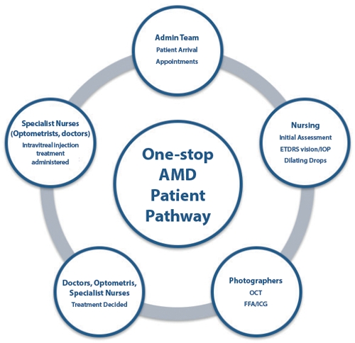 NHS Grampian AMD service covers a population of 600,000, and there has been a 10-fold increase in appointments / injections since the introduction of anti-VEGF pharmacotherapy for neovascular AMD in 2006. A two-stop service was utilised until 2012. Clinicians at Aberdeen Royal Infirmary, Scotland, evaluated a one-stop AMD service, which was established in 2013. The new service was designed to enable appropriate, timely and patient-centred care to safeguard vision in the elderly, vulnerable population to prevent blindness and reduce social burden. It involved multidisciplinary team working with doctors, nurses, optometrists, photographers and administrative personnel (Figure 1).