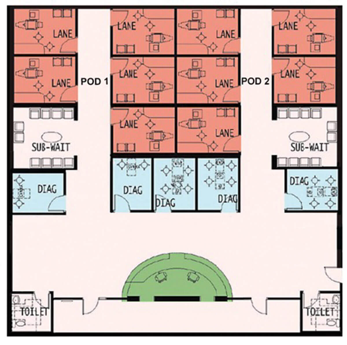Create a “pod” environment for each physician. Consider each pod as a separate doctor’s office. The pods should be designed to eliminate traffic from one physician from walking through the corridor of another physician. This limits hallway traffic in front of the exam lane, eliminating most interruptions caused by congestion.