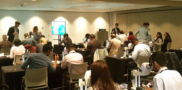 The session attended by over 50 RCOphth trainees. A focus of this simulated ocular surgery session was cataract, specifically capsulorhexis - each trainee was provided with a microscope, synthetic eye and equipment and the session was lead by multiple trainees including Mr John Ferris, Professor Larry Benjamin, Mr David Lockington, Mr Rob Scott and, notably, Mr Uday Devgan, the ‘Cataract Coach’, an ophthalmologist from California. Théa Pharmaceutical sponsored the event and provided equipment and staff to support the college with the session
