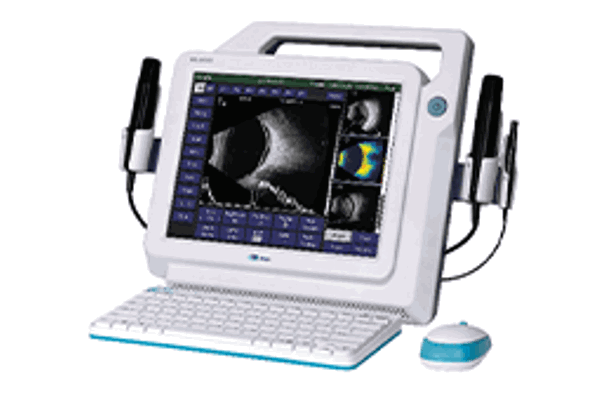 The MEDA MD-2300S ultrasonic A/B scanner, features a high definition 20MHz B-Scan image, an editable clinical report with A-scan / IOL results, B-Scan images, and textual comments with configurable entries. Has a high resolution LCD screen.